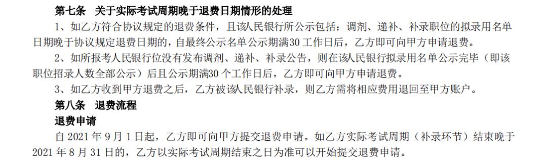 学员李享(化名)向铅笔道表示,他于2020年11月29日签约报名了课观教育的“2021 人民银行招聘考试面试协议班”,8天8晚的面授课程收费12300元。按照协议,若在8月31日之前,李享未收到人民银行入职通知,则课观教育须向其退费8500元。他从9月1日开始申请退费,被告知20个工作日退款可以到账。