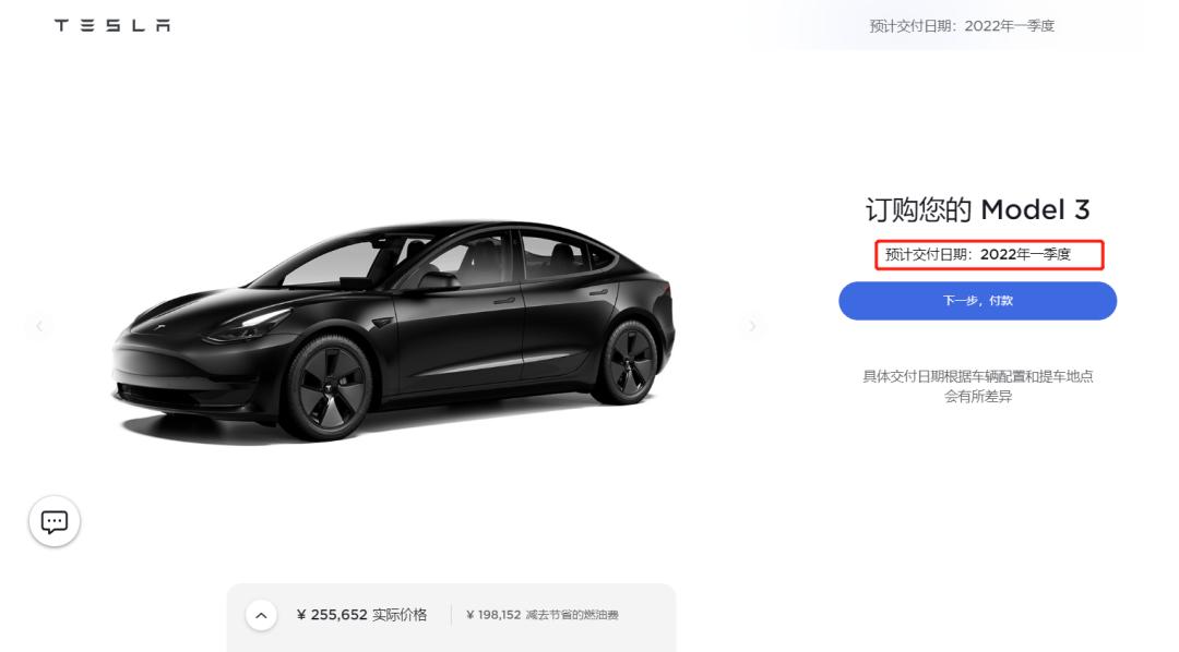 特斯拉官网的预计交付时间为2022年一季度