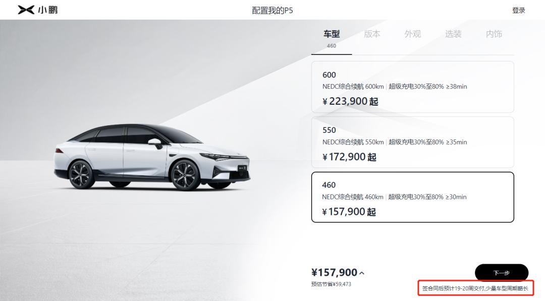 小鹏汽车官网预计的P5交付时间为下单后19-20周