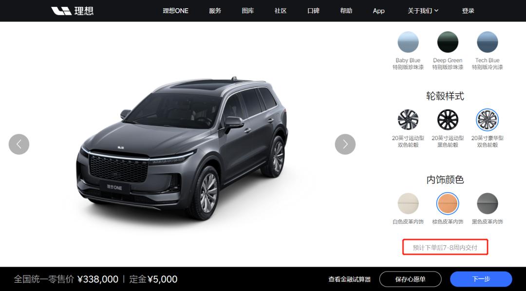 理想汽车官网的预计交付时间为下单后7-8周