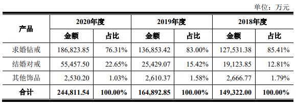 收入结构上,迪阿股份的主营业务分为求婚钻戒、结婚对戒和其他饰品三类。其中,求婚钻戒占比在80%以上。2019年,求婚钻戒实现收入13.69亿元,同期结婚对戒实现收入2.54亿元。2020年,求婚钻戒实现收入18.68亿元,结婚对戒实现收入5.55亿元。