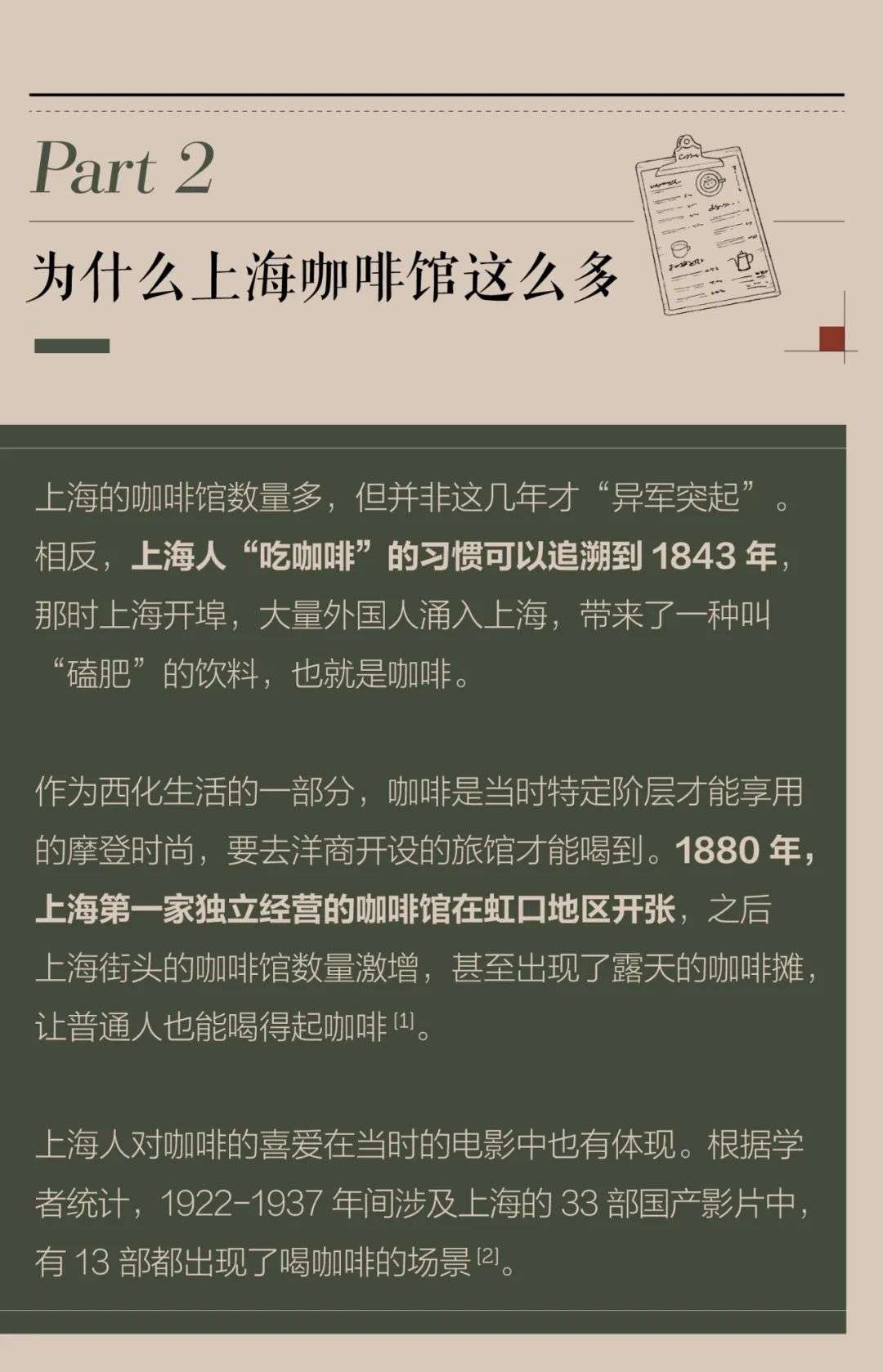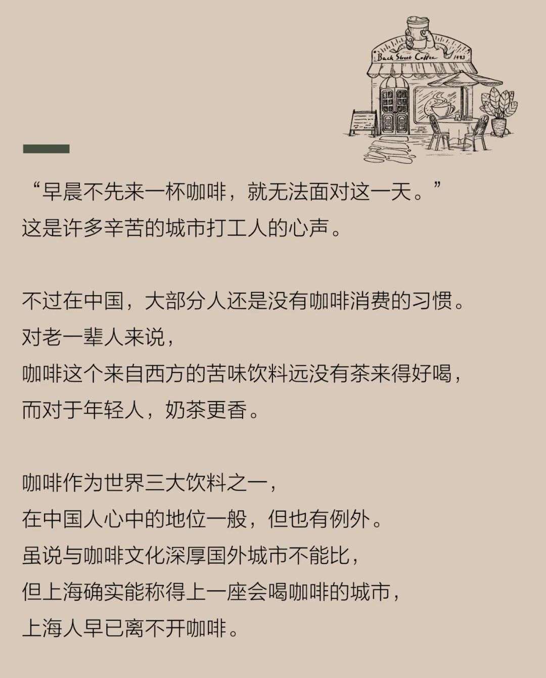 2、上海人喝咖啡的习惯可以追溯到上海开埠的 1843 年,外国人的涌入带来了咖啡,这也是上海咖啡文化浓厚的历史原因。