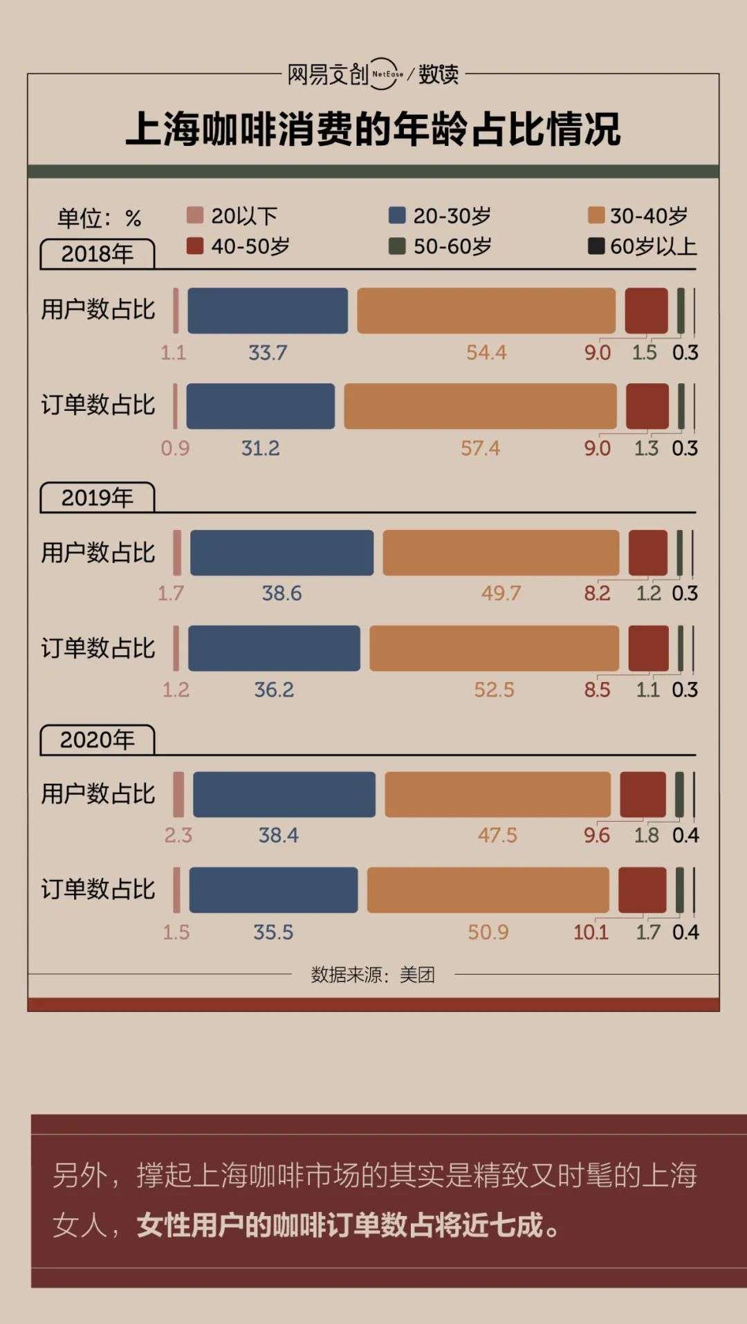 3、上海的咖啡消费人群以女性为主,30-40 岁的人群是咖啡消费的主体,但 20-30 岁的用户数和订单数占比在增加。