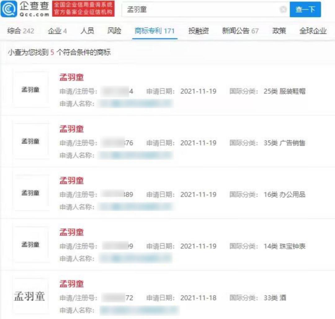 很多人甚至开始抢注孟羽童商标,最早的申请日期为 2021 年 11 月 18 日。