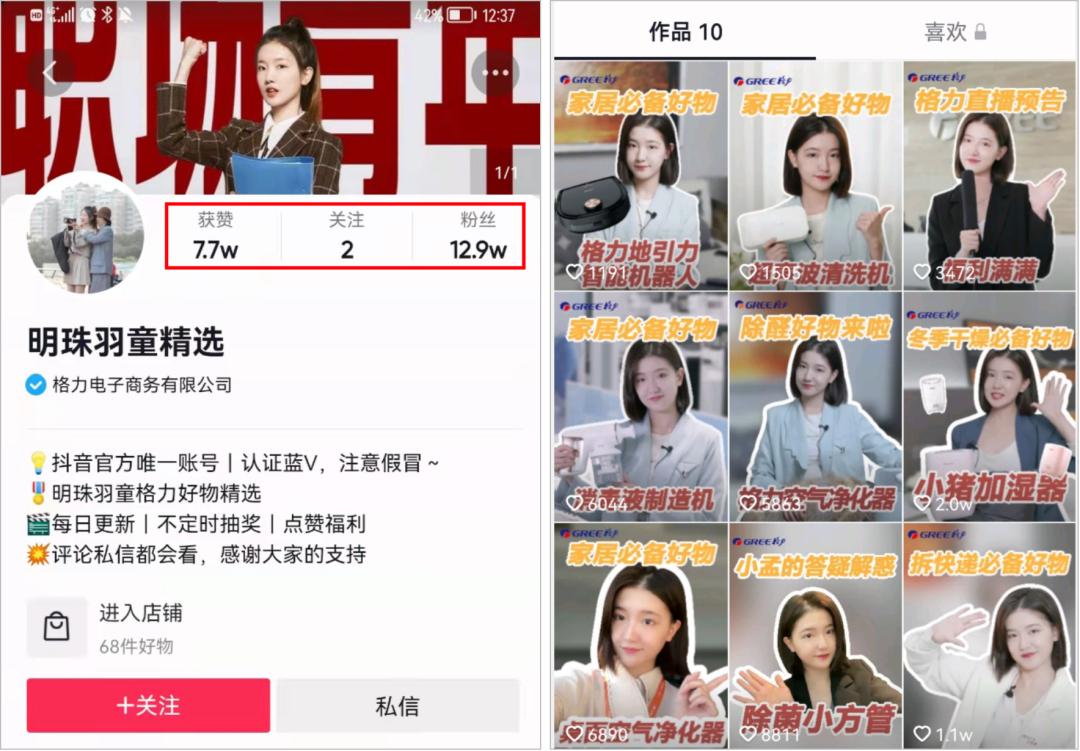 目前,“明珠羽童精选”共在抖音橱窗上架了 68 款格力电器家电产品,以小家电品类居多,销量最高的为一款超声波加湿器,售价为 129 元,销量为 799 件。
