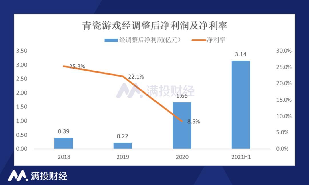 公司营收大幅增长的同时,经调整后净利润也大幅增加并实现转亏为盈,2018年至2020年,青瓷游戏经调整后净利润分别为0.39亿元、0.22亿元、1.66亿元,2021年上半年继续增长至3.14亿元,而2020年同期为亏损1.44亿元。