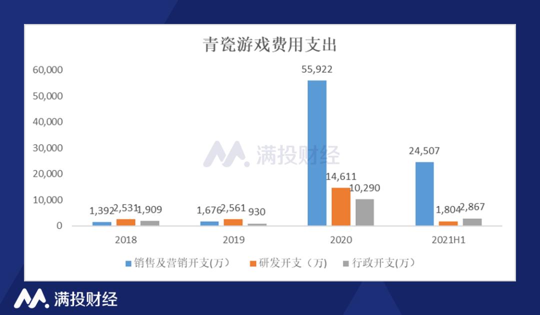 根据招股书数据,2018年至2020年,青瓷游戏产生的收入分别为0.98亿元、0.89亿元和12.3亿元,在2018年和2019年,青瓷游戏的收入仅在千万级别,2020年直接飙升至12.3亿,2021收入继续增长,仅半年时间,就创造了7.6亿元的收入。