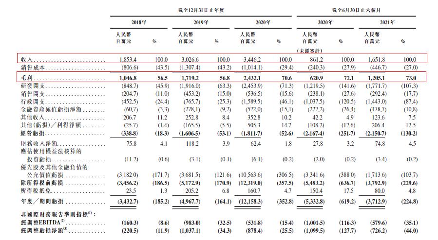 数据显示,2018-2020年商汤科技总营收分别为18.53亿、30.27亿和34.46亿,今年上半年营收为16.52亿,较去年同期的8.61亿进步明显。此外,商汤科技的毛利率也在改善,从2018年的56.5%提升至今年上半年的73%,毛利润从2018年的10.47亿增长至去年的24.32亿,今年上半年暂录得12.04亿。
