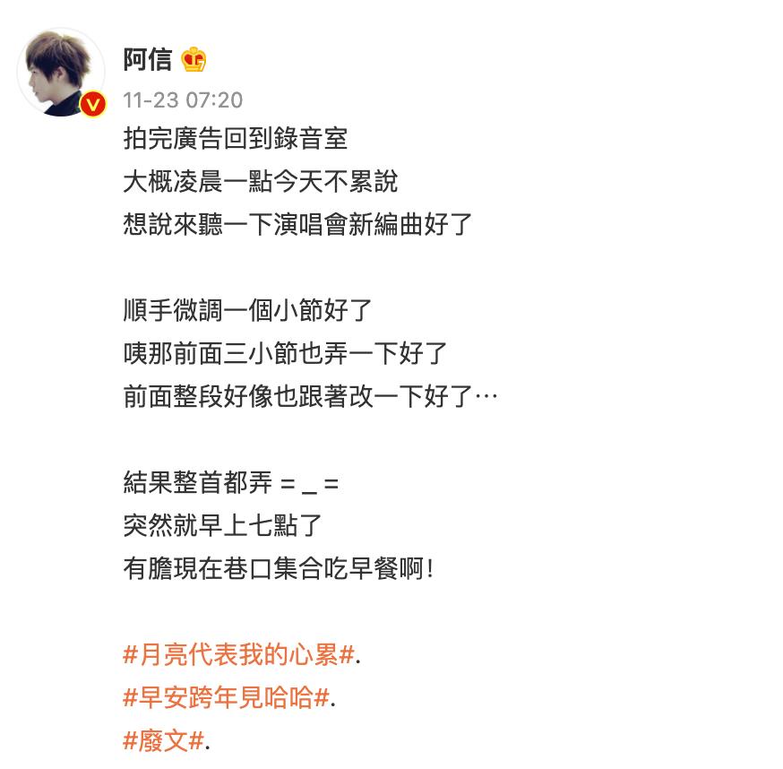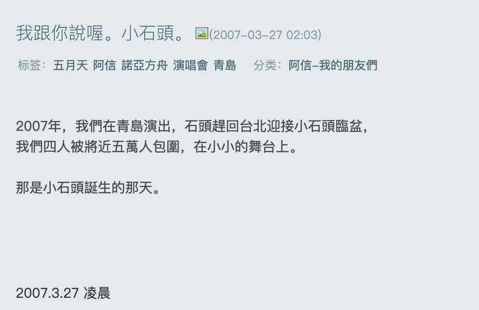 对于五月天的歌迷来说,这不是一条普通的微博,阿信在文字中回忆了一些大家共同成长的历程,从上海大舞台到八万人体育场,从“后青春期的诗发行了”到“连自传都写完了”。