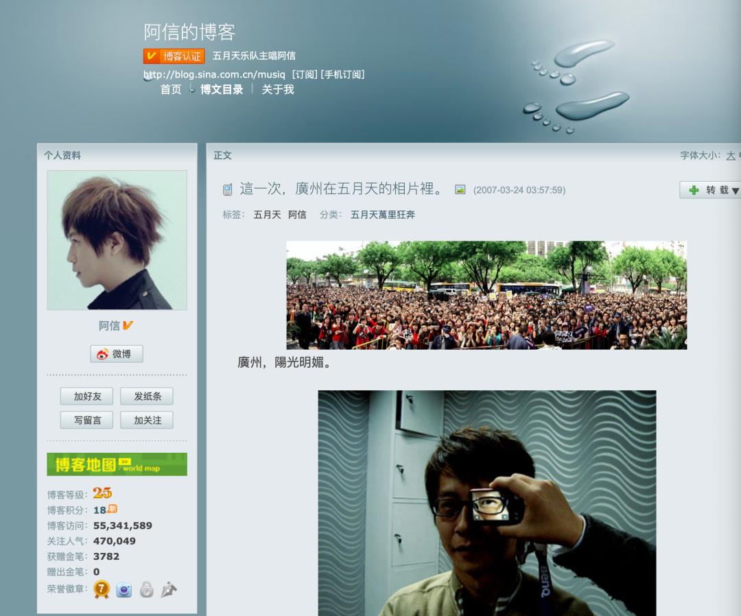 阿信的新浪博客,目前能找到的最早一篇发布于2007年3月24日,是在广州表演后的记录。