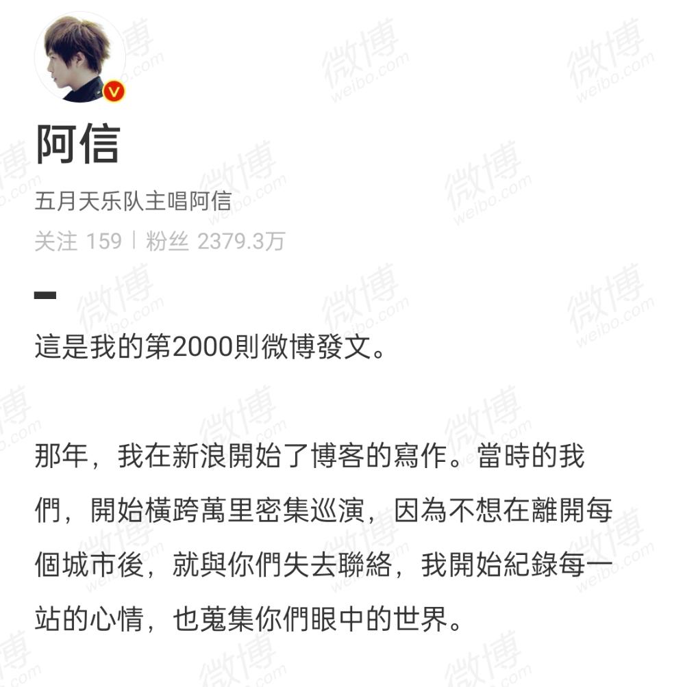 “这是我的第2000则微博发文。”12月4日,五月天主唱阿信,在微博上发布了一条长文,文中记述了他这些年来使用微博的一些感悟。