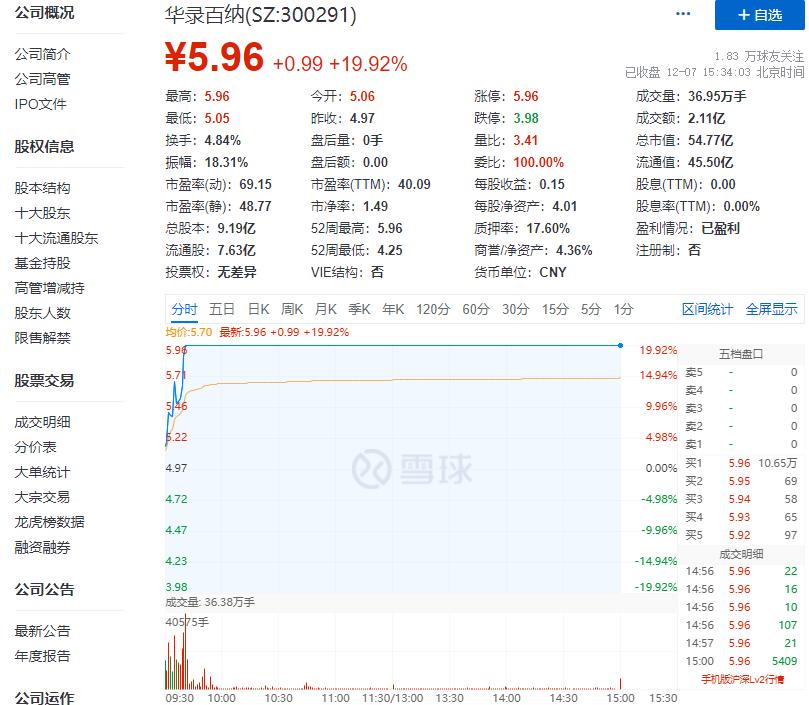 20cm的涨停,今天(12月7日)可能是华录百纳历史上最硬气的一天。