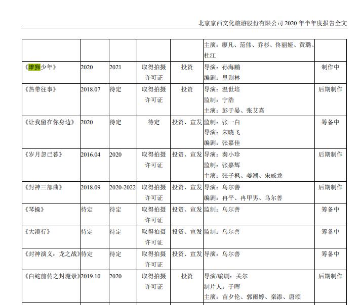 《雄狮少年》就是其中代表。搜索北京文化公开的资料显示,2019年年报上还有关于《雄狮少年》正在制作的信息,2020年半年报依然是制作状态。但是在2020年年报中莫名其妙的消失了,转而出现在华录百纳的年报中,项目状态为发行阶段。