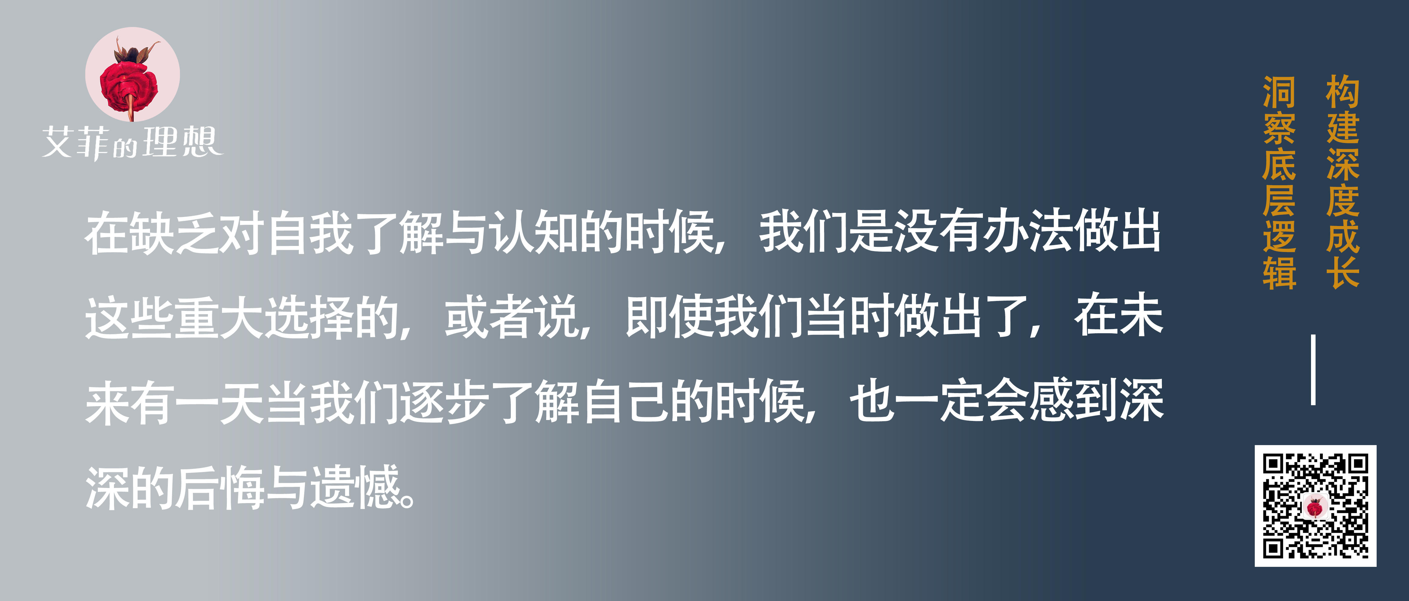 在缺乏对自我了解与认知的时候,我们是没有办法做出这些重大选择的,或者说,即使我们当时做出了,在未来有一天当我们逐步了解自己的时候,也一定会感到深深的后悔与遗憾。而对自我的觉知与了解,正是在帮助我们在面临每一次抉择的时候,做出更加适合自己的选择。