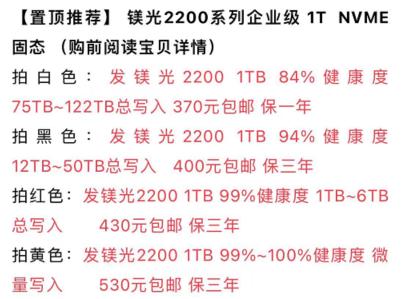 一般而言,二手售价最高的矿盘是消费级固态硬盘,因为这些硬盘可以享受官方的售后,出了问题还有官方兜底。其次就是OEM固态硬盘和企业级固态硬盘,两者均不支持个人送修,如果使用中损坏你只能祈祷卖家还愿意为你提供售后,但是在闲鱼上购买的话,基本就别指望后续还能找到人了。