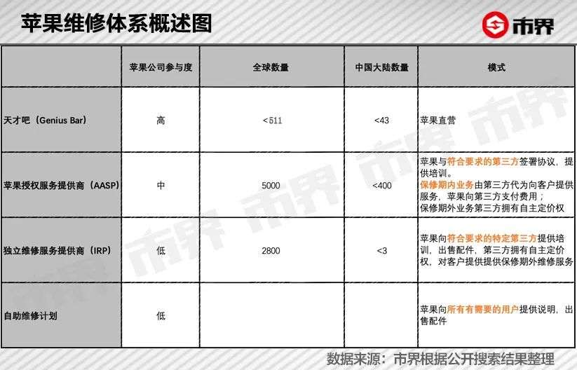 截至目前,苹果的维修体系包含三种,按照苹果官方的参与程度排列,分别是在苹果直营店内设独立区域的天才吧(Genius Bar)、全球5000家的苹果授权服务提供商(以下简称“AASP”)和2800家独立维修服务提供商(以下简称“IRP”)。