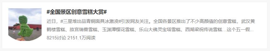 然而,目前最热的博物馆文创产品当然是造型各异的文创雪糕,比如三星堆博物馆的“堆堆”雪糕、秦始皇帝陵博物院的“俑”气雪糕、首都博物馆的青铜器“伯矩鬲”的雪糕、天津博物馆的芍药雉鸡图玉壶春瓶雪糕和翡翠蝈蝈白菜雪糕等等。闻旅通过搜索发现,截至12月7日,微博话题#全国景区创意雪糕大赏#达2151.8万阅读量,讨论8215次;话题#文创雪糕大赛#拥有4500.2万次阅读量,讨论1.4万次;相关衍生话题累计阅读量更是超千万。