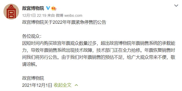 12月1日,故宫博物院(以下简称“故宫”)年票销售系统被赶来购买年票的消费者挤瘫了。故宫方面也表示,因短时间内购买故宫年票观众数量过多,超出故宫年票销售系统的承载能力,导致年票销售系统出现技术故障。