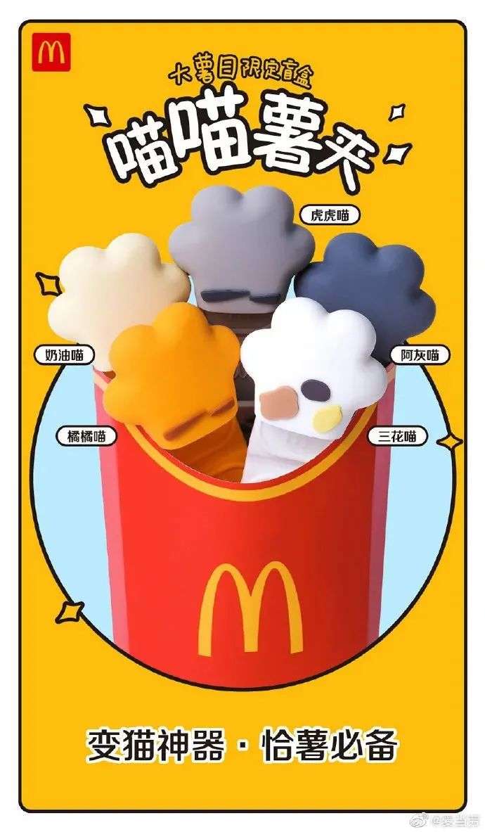 事实上,这已经不是麦当劳第一次跨界宠物圈了。去年,麦当劳在大薯日就发布了一组变猫神器——喵喵薯夹。