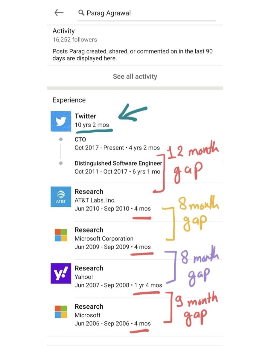 “看了他的经历后,我很震惊”,Nischay Jain 在帖子中写道,“十分之九的招聘人员会拒绝 Parag Agrawal 的简历,因为他的职业生涯很多处于空白期,而且频繁更换工作。如果 Twitter 的人力资源部门在 10 年前也这么做的话,他们就会失去一位成为新 CEO 的人才。”