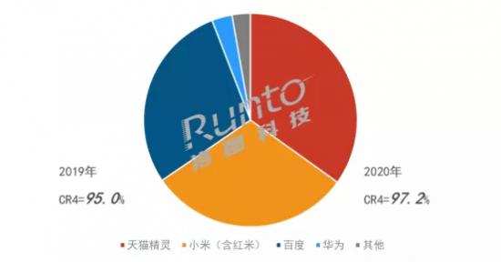 2017-2019年,国内智能音箱市场增速迅猛,增长率分别为2000%、800%、109%,至2019年为止,年销售量超5200万台,其中,阿里百度小米三家占据了市场超95%以上的销量。