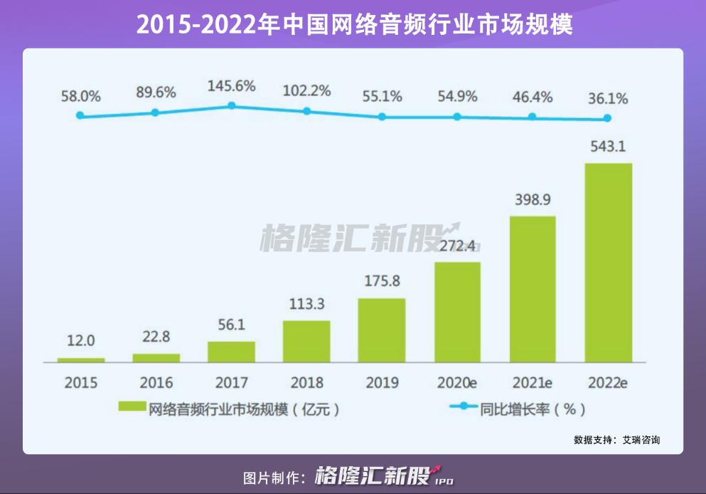 2019年,中国网络音频行业市场规模为175.8亿元,同比增长55.1%,预计到2022年,该规模将增至543.1亿元。