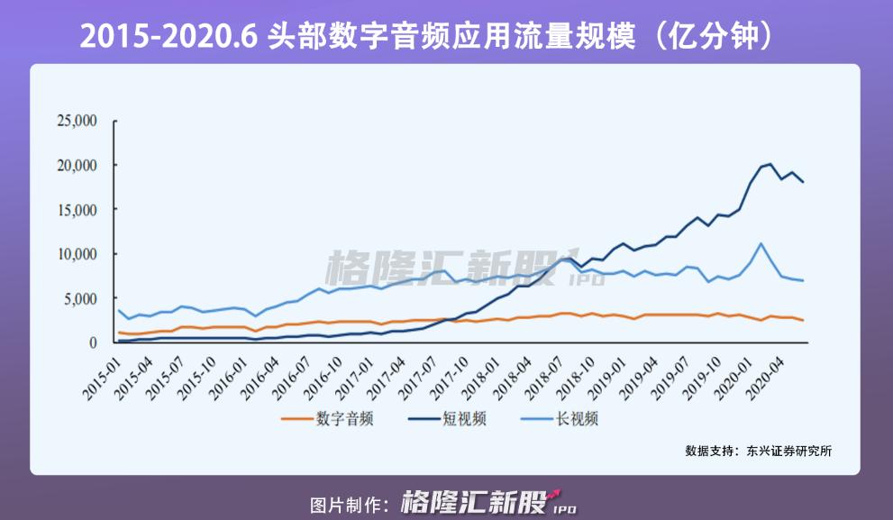数据显示,数字音频流量规模由2015年1月的1070亿分钟增长至2020年6月的2517亿分钟,2020年6月,长视频流量规模和短视频流量规模分别是是数字音频的2.8倍、7.2倍。