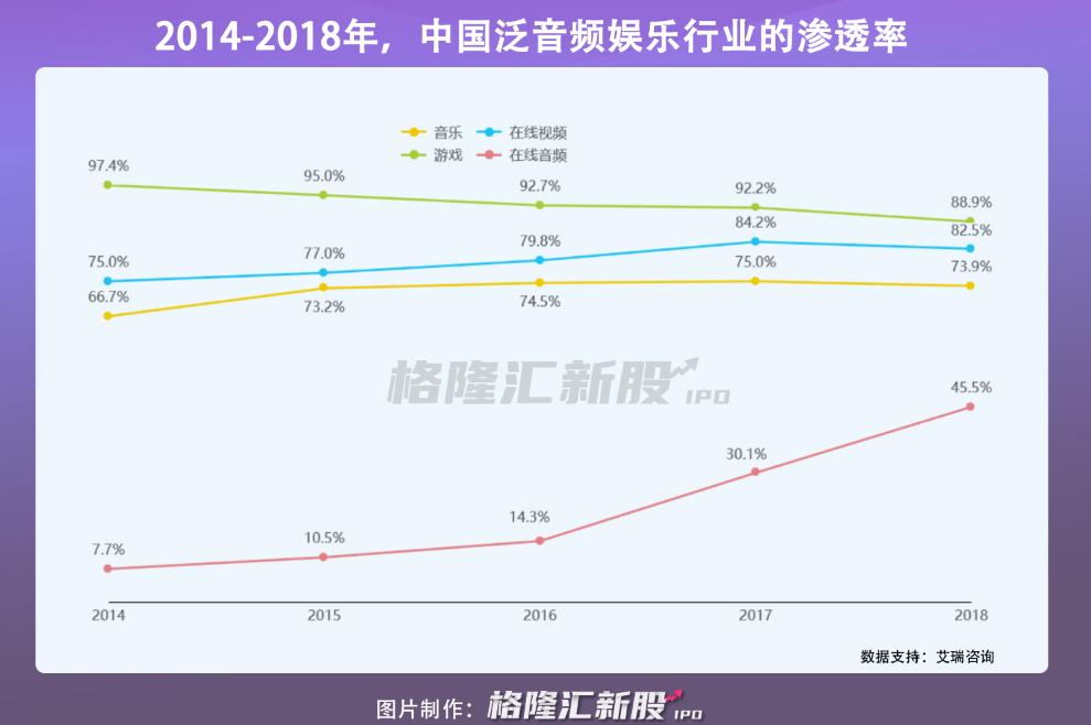 如今,音乐、游戏、在线视频的行业渗透率均超70%,大厂们争夺互联网使用时长的战火也不意外乎地烧到了在线音频领域。