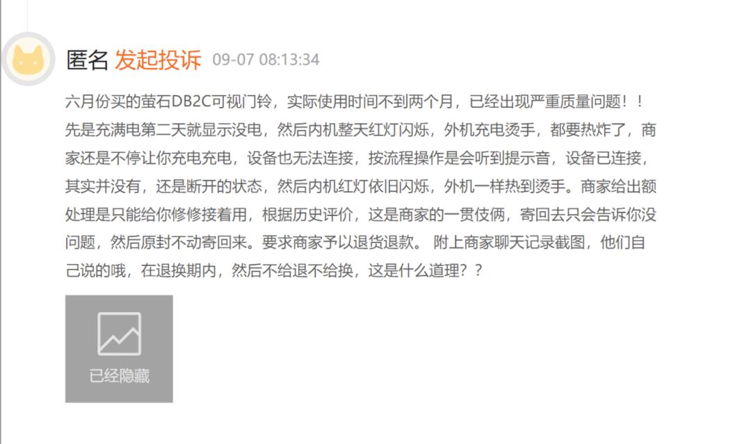 设计初衷是为消费者生活提供便利的智能家居产品,却不时的成为用户的烦恼来源,而售后存在意义更像是在产品质量存在问题时充当企业的最后一道“保障”。作为一家即将上市的企业,萤石网络的产品却存在质量问题和售后不理想的情况,着实有些不应该。