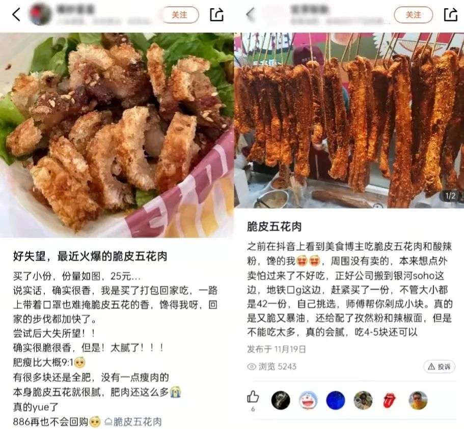 很多人都是从抖音上大小视频博主“打卡”中知道脆皮五花肉的,博主们露出惊讶赞叹的表情,“嘎嘣脆,外酥里嫩,值,真香”。看的人不知道它怎么突然就红了,但到处都能刷到,的确有“红”的感觉,于是也想去试吃。