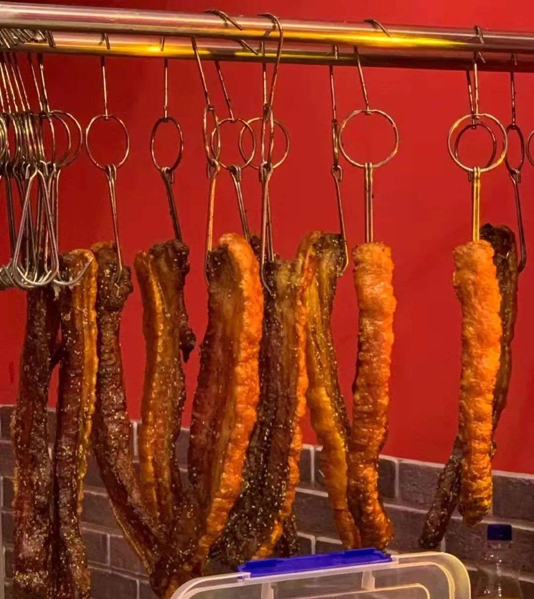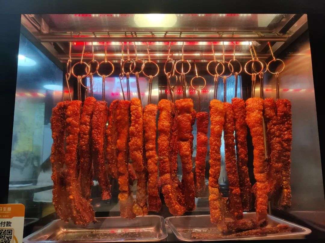 不奇怪,一排烤得红得发油发亮的约20cm长的五花肉整整齐齐挂在那里,视觉冲击力比一般小吃要强得多,仿佛隔着屏幕就能闻见焦香的肉味,不管味道怎样,眼福已经饱了,去线下购买的“草”也种上了。