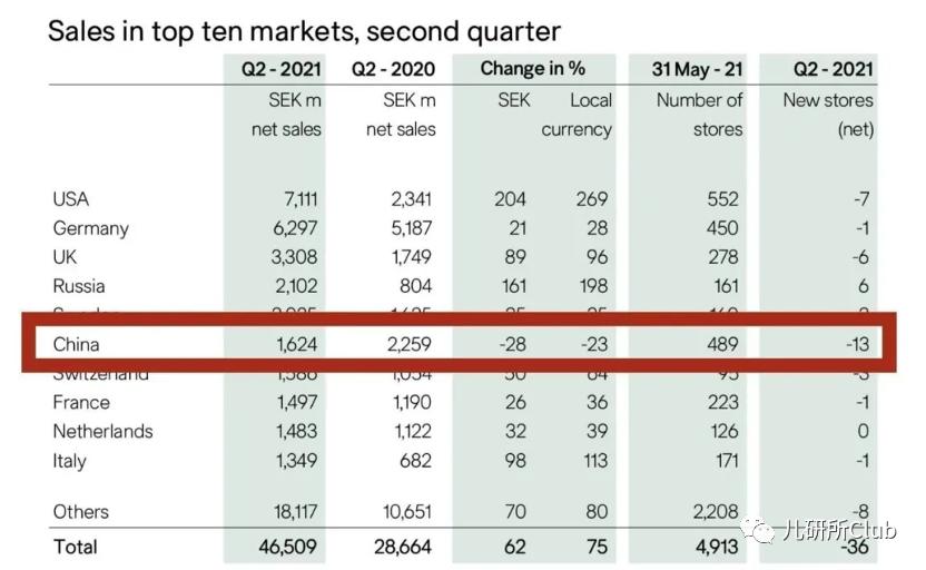 2021年二季度财报显示,中国内地市场在H&M全球市场中排名仅居第六。然而在今年一季度,中国内地市场是H&M集团仅次于美国和德国的第三大市场,占该公司销售额约6%,也是H&M在疫情期间销售额唯一增长的主要市场。2020财年时,中国内地销售总额还是H&M集团全球前四大市场之一,占比达5.2%。