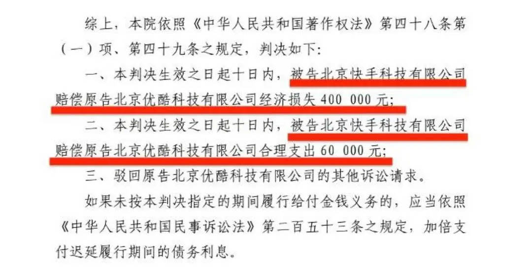在北京互联网法院对优酷诉快手侵权《冰糖炖雪梨》一案的一审判决书中,法院判决快手赔偿优酷46万元人民币,其中,40万为经济损失,6万为合理支出,其余案件受理费优酷承担约三分之一,快手承担另外三分之二。
