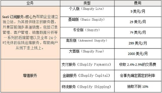 因此,支付、物流、金融才是Shopify的营收大头,直接向商家收取的SaaS订阅服务费可以压得很低——个人版和基础版仅为每月9美元和29美元,相比之下,有赞的SaaS订阅服务费最低价是每年6800元。