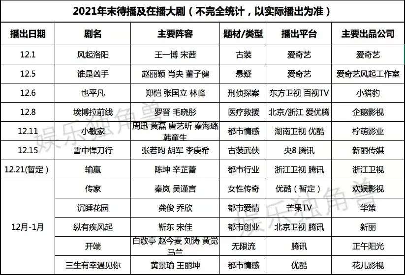 总的来看,今年底无论是平台、亦或者是各大影视公司,它们在“年末”这个重要档期中,都积极参与并贡献出多个头部项目。这于一年未曾诞生过一部年度爆款的剧集市场而言,无疑是好事一件。