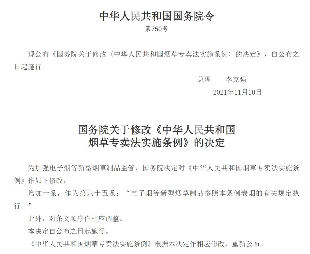 11月10日,《国务院关于修改〈中华人民共和国烟草专卖法实施条例〉的决定》正式公布施行,明确“电子烟等新型烟草制品参照本条例卷烟的有关规定执行”。