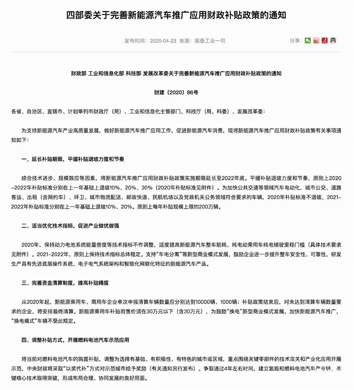 四部委去年关于财政补贴的通知指出,原则上2020-2022年补贴标准分别在上一年基础上退坡10%、20%、30%。2020年执行的标准是,对于纯电动乘用车,NEDC续航300-400km的,补贴16200元,续航大于400km的车,补贴22500元。PHEV及增程式新能源车纯电续航大于50km,补贴8500元。