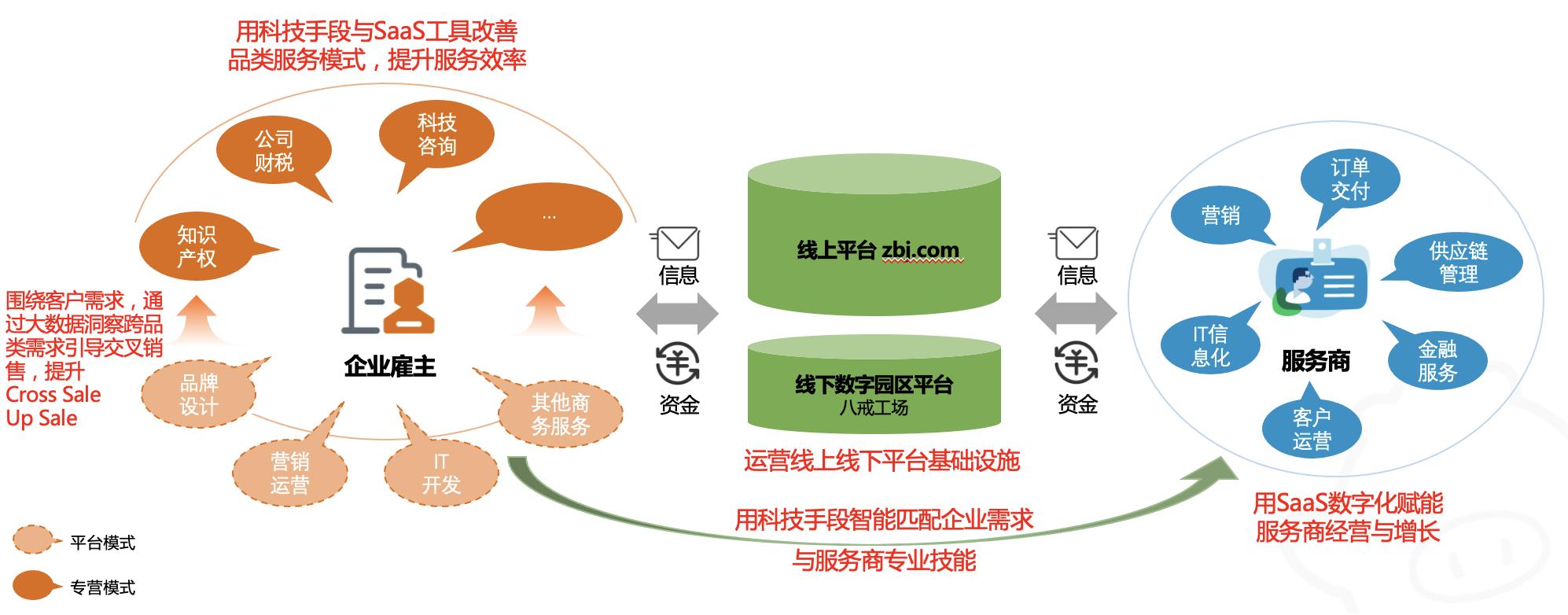 猪八戒网运营了一个线上平台“猪八戒(zbj.com)”,以及一个线下平台(八戒工场),有了这个平台之后,聚集服务商和企业雇主,连接他们,围绕企业的经营,提供全生命周期服务。