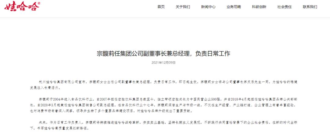 12月9日,娃哈哈集团在官网发布新闻,宣布宗馥莉出任集团副董事长兼总经理,负责日常工作,“与宗庆后一同,为娃哈哈的稳健发展注入长青活力”。其父宗庆后仍为集团董事长。