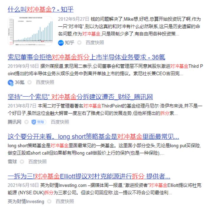 在百度搜索输入关键词“对冲基金+拆分”的结果