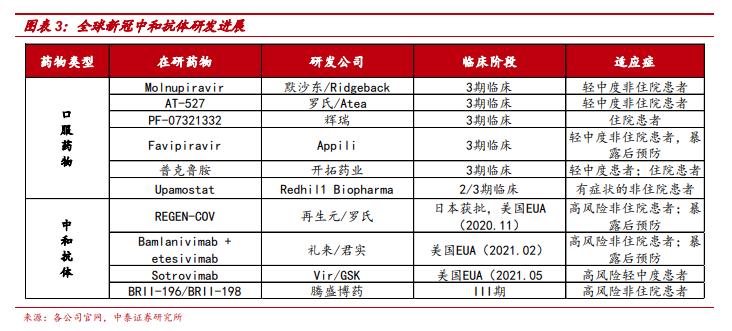 如上图所示,在海外,则有再生元/罗氏的REGEN-COV、君实生物/礼来制药的Bamlanivimab+etesevimab、Vir Biotechnology/葛兰素史克的Sotrovimab等中和抗体或组合疗法,它们均已获得美国紧急使用授权,用于治疗轻度至中度新冠肺炎患者,或是暴露后预防。