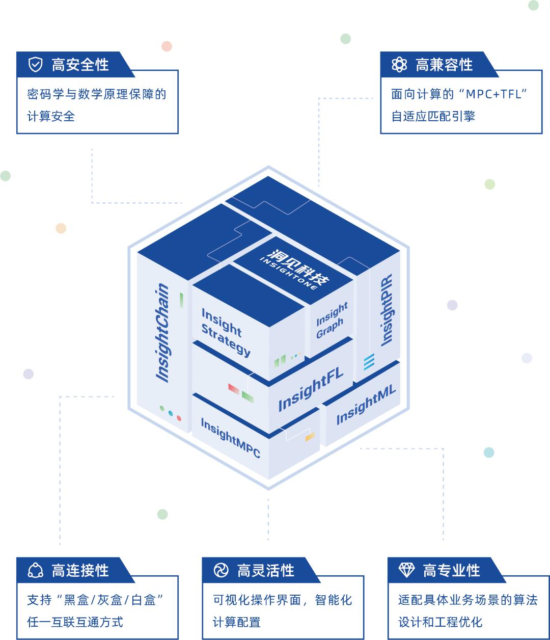 本次通过评测认证的洞见数智联邦平台(INSIGHTONE),是洞见科技基于安全多方计算、可信联邦学习、区块链等技术独立创新自研的隐私保护计算平台产品,具有「高安全性、高兼容性、高连接性、高灵活性、高专业性」五大特点。