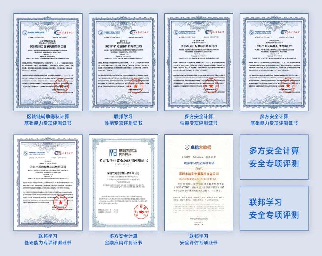 此外,洞见数智联邦平台(INSIGHTONE)还顺利通过中国信通院「卓信大数据计划」的「联邦学习安全评估专项」,以及国家金融科技检测中心(银行卡检测中心)的「多方安全计算金融应用评测」。