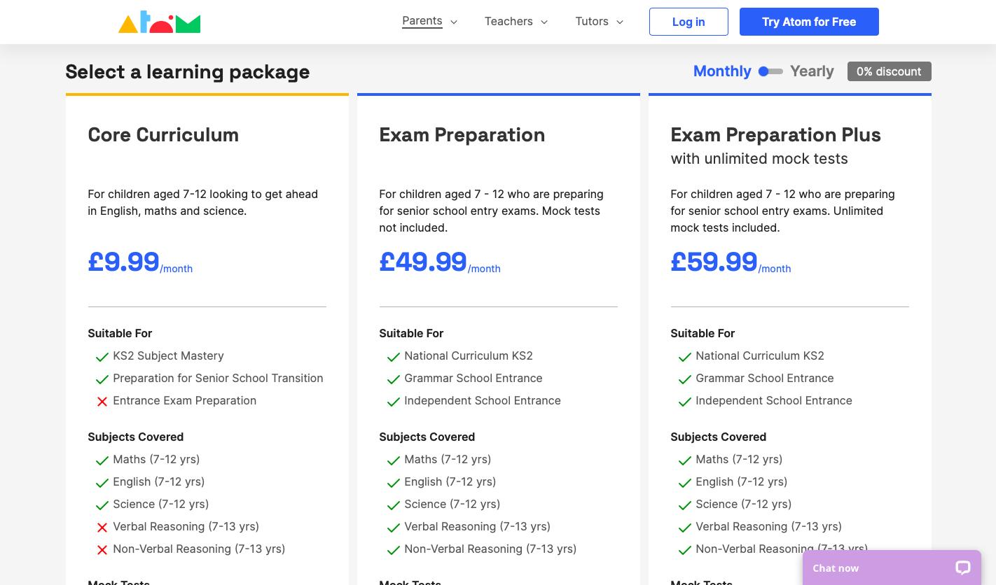 「Atom Learning」现阶段推出了3种模式:根据国家核心课程考纲制定的基础知识教学(定价为9.99英镑/月),专门针对私立学校和文法学校的高中入学考试的培训(定价分别为49.99英镑/月和59.99英镑/月)。
