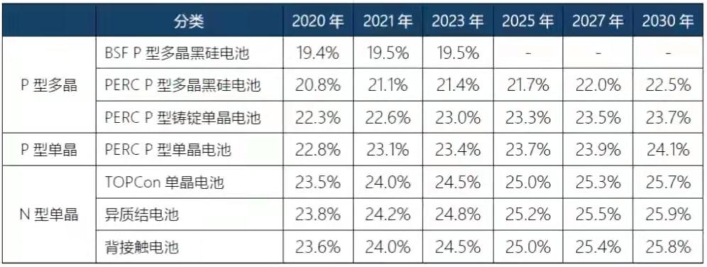 N型电池主要分为TOPCon、HJT(异质结)、IBC三种,根据ISFH的数据,PERC、HJT、TOPCon电池的理论极限效率分别为24.5%、27.5%、28.7%。到2030年,N型电池的转换效率将超25.5%,比P型电池高出1个百分点以上。CPIA对此做出预测,届时N型电池的市占率或将达到56%左右。