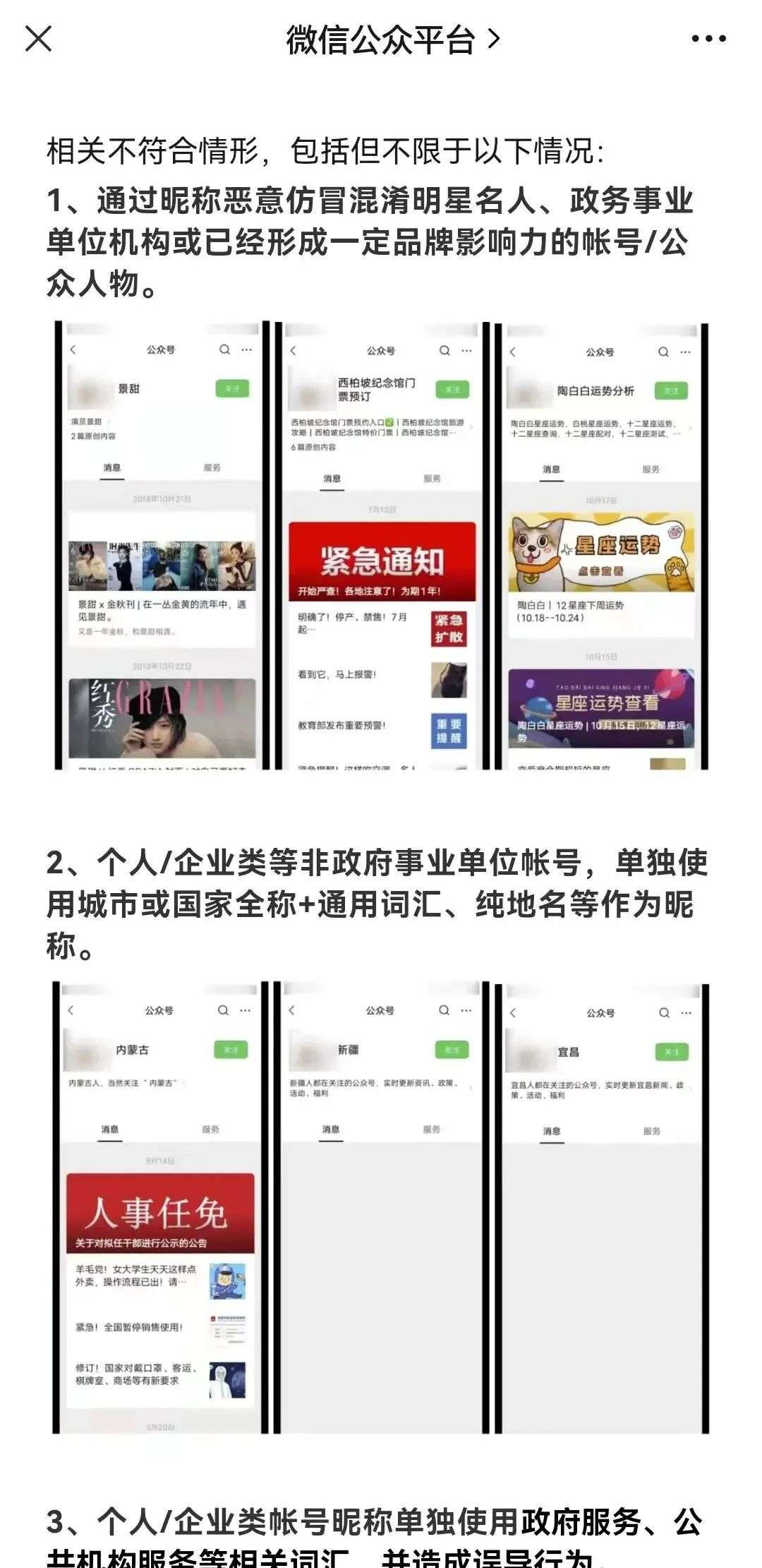 微信平台随之响应,提供了昵称违规使用案例解析,并强调“如经核实存在违反《微信公众平台运营规范》的,平台将根据违规程度采取处理措施,包括但不限于:清空帐号违规要素,对涉及到严重混淆仿冒行为的帐号进行封号等。”