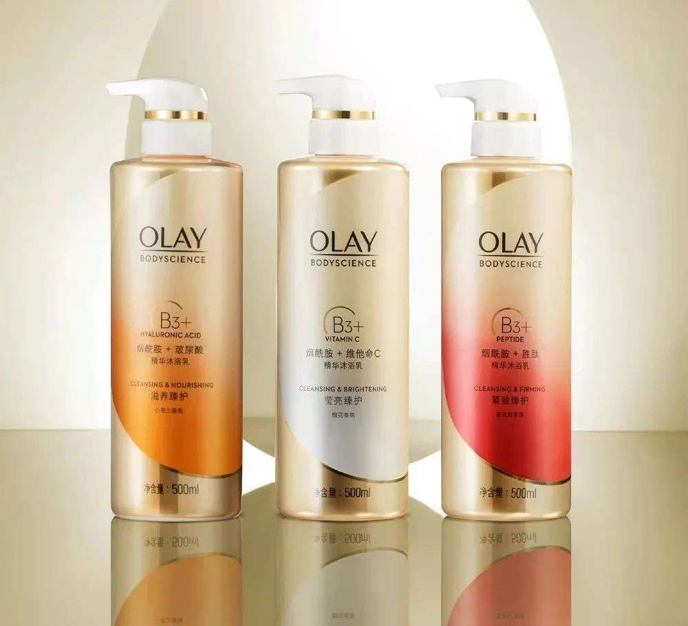 也有部分品牌不会直接宣称“可以洁面”,但会从护肤成分的角度进行营销。比如,OLAY推出的精华沐浴露中,宣称添加了“面部护肤王牌成分烟酰胺”,并且根据主打功效的不同,推出不同的单品,将烟酰胺分别与肌肽、玻尿酸和维C等热门护肤成分搭配使用。