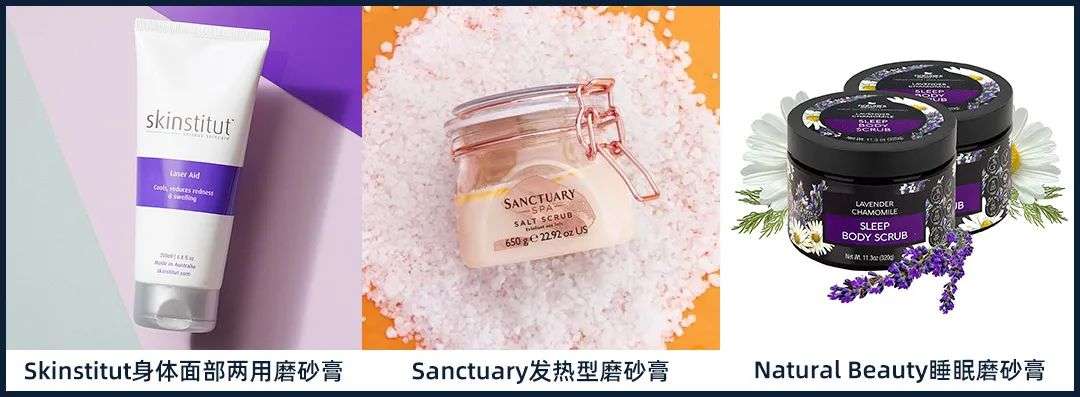 近几年,磨砂膏的种类也越来越丰富,其发展方向越来越广阔。伦敦SPA护理品牌Sanctuary推出了发热型的磨砂膏;澳大利亚护肤品牌 Skinstitut的磨砂膏可适用于身体及面部;还有加拿大香薰护肤品牌Natural Beauty的薰衣草洋甘菊睡眠身体磨砂膏,结合植物精油成分和香型,发挥助眠的效果。