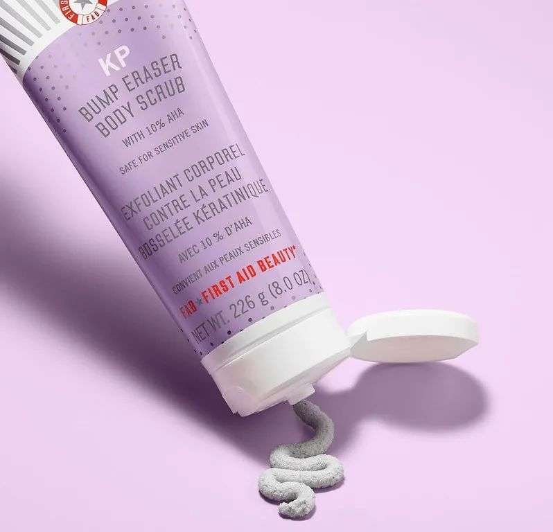 国外的一些功效护肤品牌也曾推出磨砂膏产品。比如,美国的敏感皮肤护理品牌 First Aid Beauty,曾推出含有10% 乙醇酸和乳酸的KP Bump Eraser 身体磨砂膏,其中添加了浮石抛光珠形式的物理去角质剂,以及舒缓保湿成分红没药醇、维生素E。据称,该产品经过皮肤科医生测试,对去死皮和改善鸡皮肤有一定作用。