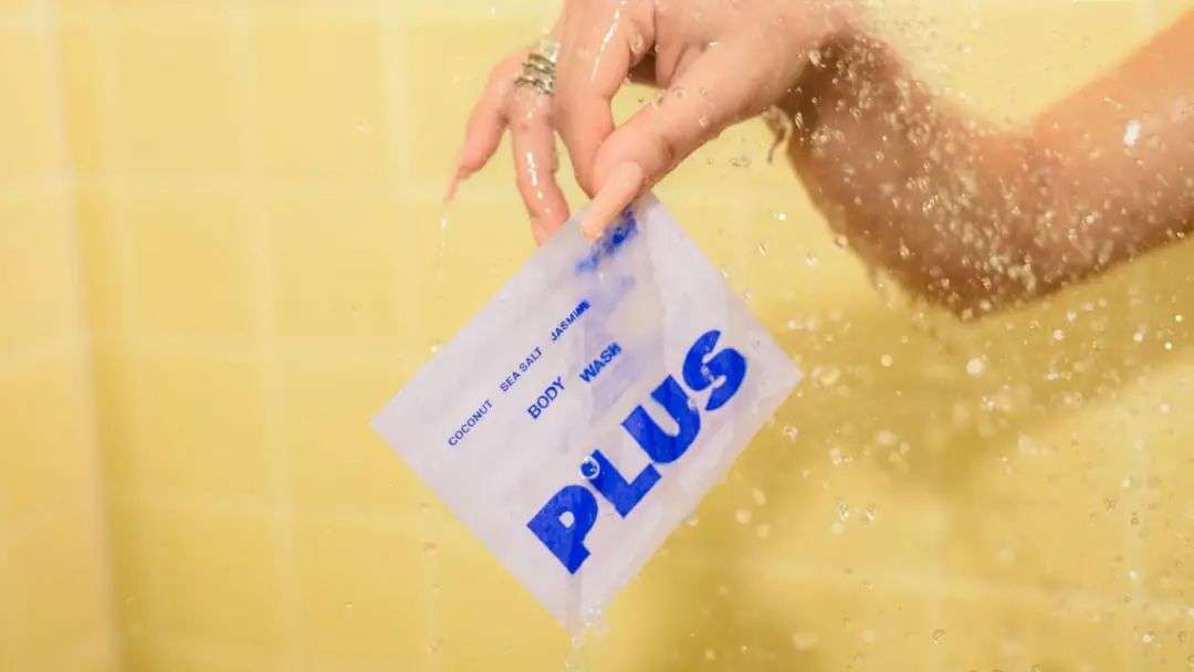为了减少塑料包装,有的品牌更是直接采用了“无瓶”模式。比如美国的无水美容品牌Plus,在今年4月份推出“无瓶”沐浴露,产品为100%可降解,沐浴后会被水完全冲走。由于沐浴露为小体积的固态片状,有助于解决传统沐浴露的水运输和一次性塑料包装问题。